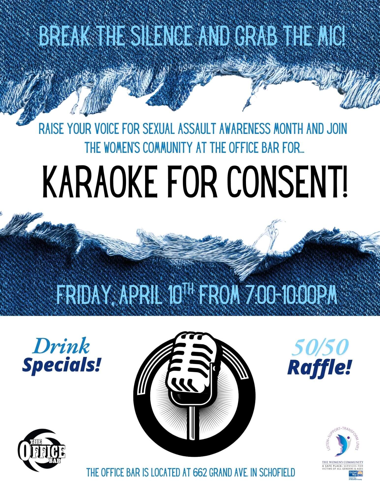 « All Events Karaoke for Consent! April 10 @ 7:00 pm - 10:00 pm « April Sexual Assault Awareness and Child Abuse Prevention Month Events, 2026 Denim Day – Dollars for Denim Campaign » Add to calendar Google Calendar iCalendar Outlook 365 Outlook Live Details Date: April 10 Time: 7:00 pm - 10:00 pm Venue The Office Bar 622 Grand Ave. Schofield, WI 54476 + Google Map