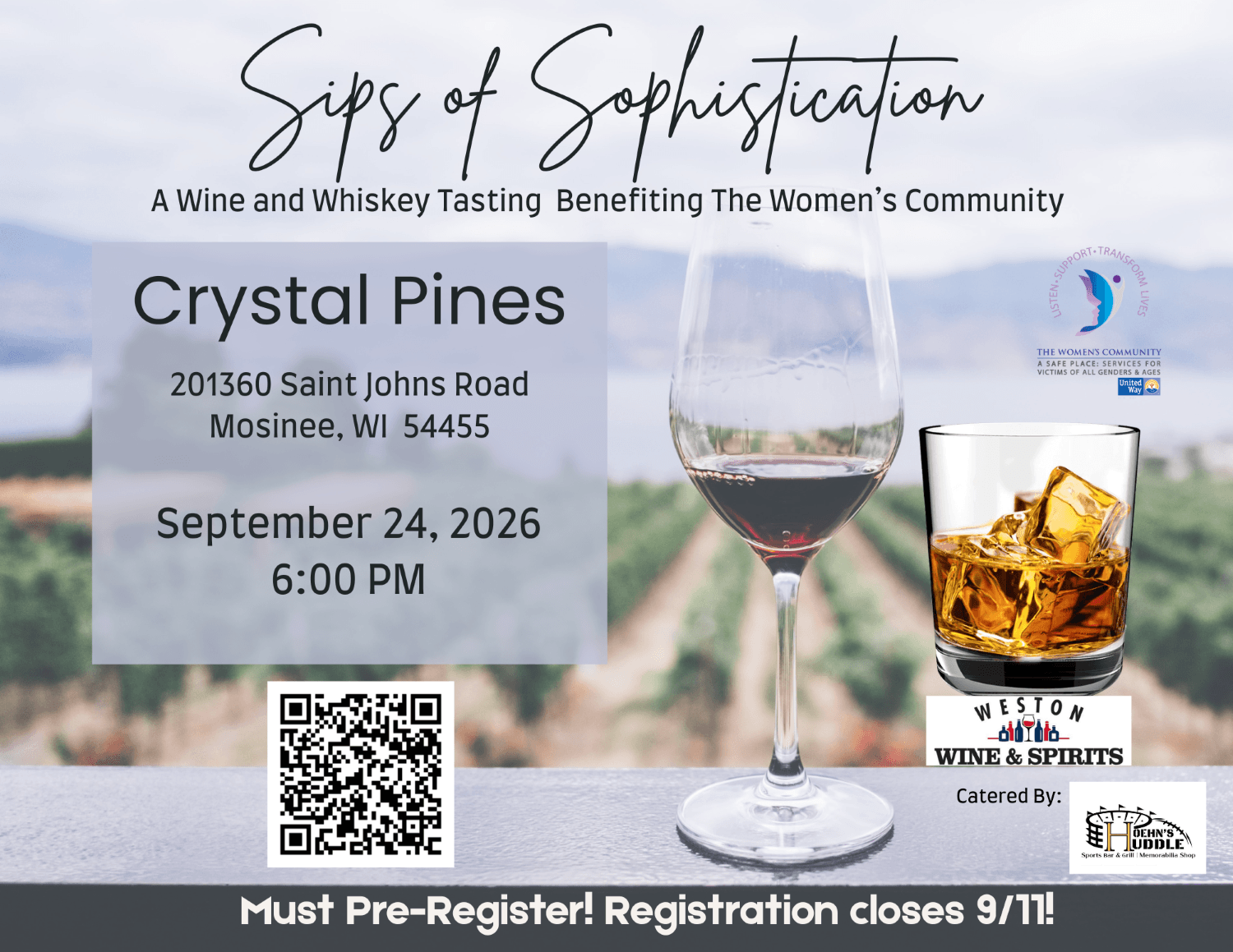 « All Events Sips of Sophistication – Wine and Whiskey Tasting September 24 @ 6:00 pm - 9:00 pm « History & Hope: Understanding The Women’s Community Add to calendar Google Calendar iCalendar Outlook 365 Outlook Live Details Date: September 24 Time: 6:00 pm - 9:00 pm Organizers The Women’s Community Weston Wine & Spirits Venue Crystal Pines 201360 Saint Johns Road Mosinee, + Google Map